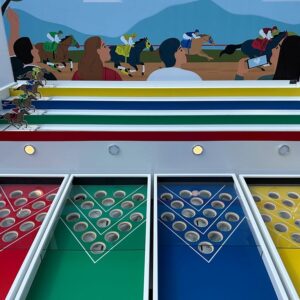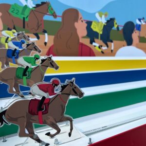 Bis zu vier Spieler treten gleichzeitig gegeneinander an. Die „Jockeys“ rollen Kugeln in die Löcher der Bahn – je nach Treffer bewegt sich das Rennpferd ein Stück nach vorne. Mit jedem Wurf steigt die Spannung, bis schließlich das schnellste Pferd die Ziellinie überquert. Licht- und Soundeffekte sorgen zusätzlich für ein packendes Finale.